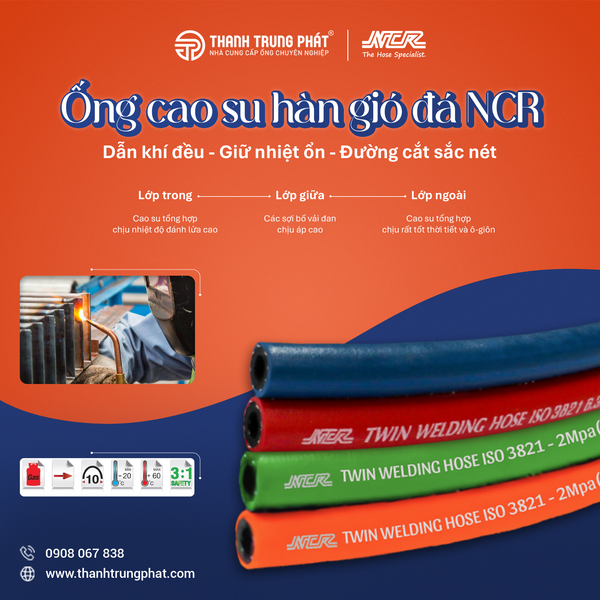 Ống cao su hàn gió đá NCR của Thanh Trung Phát là ví dụ điển hình về sản phẩm chất lượng, chịu áp lực cao, tuổi thọ lâu dài, thích hợp cho cả Oxy + Acetylene và Oxy + LPG. Đầu tư vào ống chất lượng cao không chỉ bảo vệ thiết bị mà còn nâng cao hiệu quả, an toàn và tuổi thọ của hệ thống hàn.