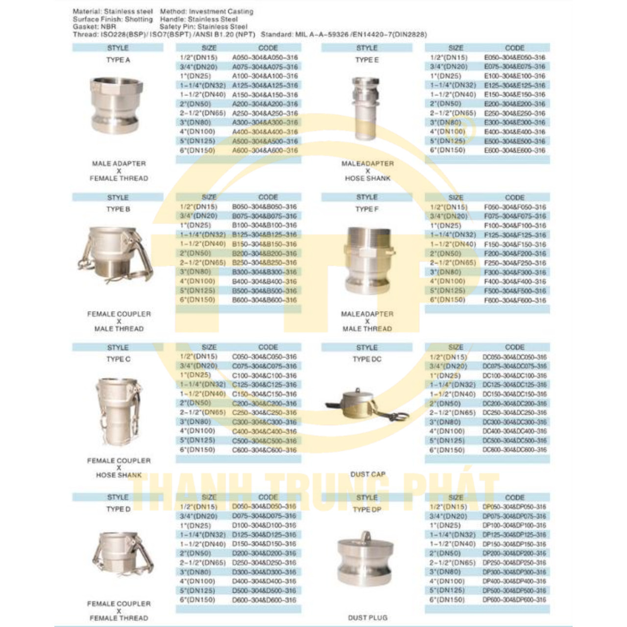 Sản phẩm được sản xuất từ vật liệu Inox SS304/SS316, nổi bật với khả năng chống ăn mòn và chịu nhiệt tốt, đáp ứng được yêu cầu cao về độ bền trong các ứng dụng công nghiệp. Với kích thước từ DN15 đến DN150, khớp nối nhanh Camlock kiểu F dễ dàng tương thích với nhiều hệ thống khác nhau, từ xăng dầu, dầu khí đến nước thải và hóa chất.