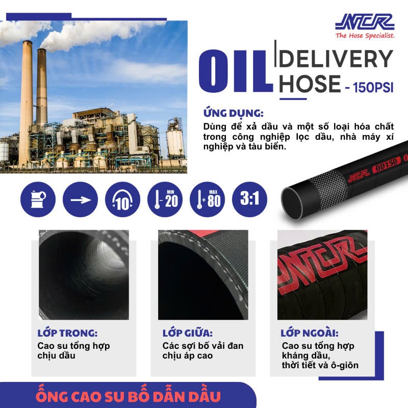 Ống cao su bố dẫn xăng dầu NCR - OD150 là sản phẩm chất lượng cao thuộc thương hiệu NCR, nổi tiếng với công nghệ tiên tiến từ Nhật Bản và xuất xứ Thái Lan. Đây là dòng ống chuyên dụng cho các hệ thống dẫn xăng dầu, đặc biệt là trong môi trường công nghiệp khắc nghiệt như nhà máy lọc dầu, xí nghiệp, tàu biển và nhiều ứng dụng khác.