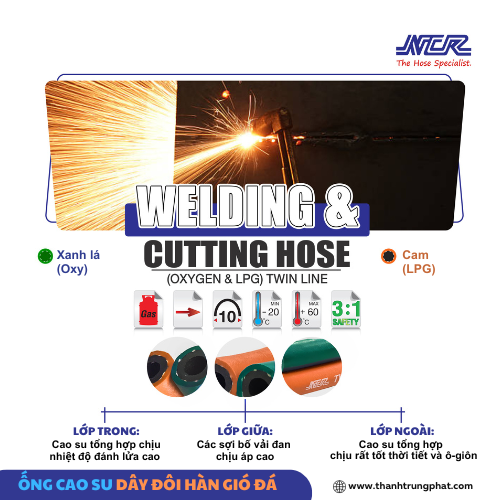 - Lớp trong: Được làm từ cao su tổng hợp chất lượng cao, lớp trong của ống có khả năng chịu được nhiệt độ đánh lửa cao, đảm bảo an toàn khi dẫn khí Oxy và LPG trong các quy trình hàn cắt. Lớp cao su này được thiết kế để duy trì khả năng hoạt động bền bỉ ngay cả trong những môi trường khắc nghiệt.